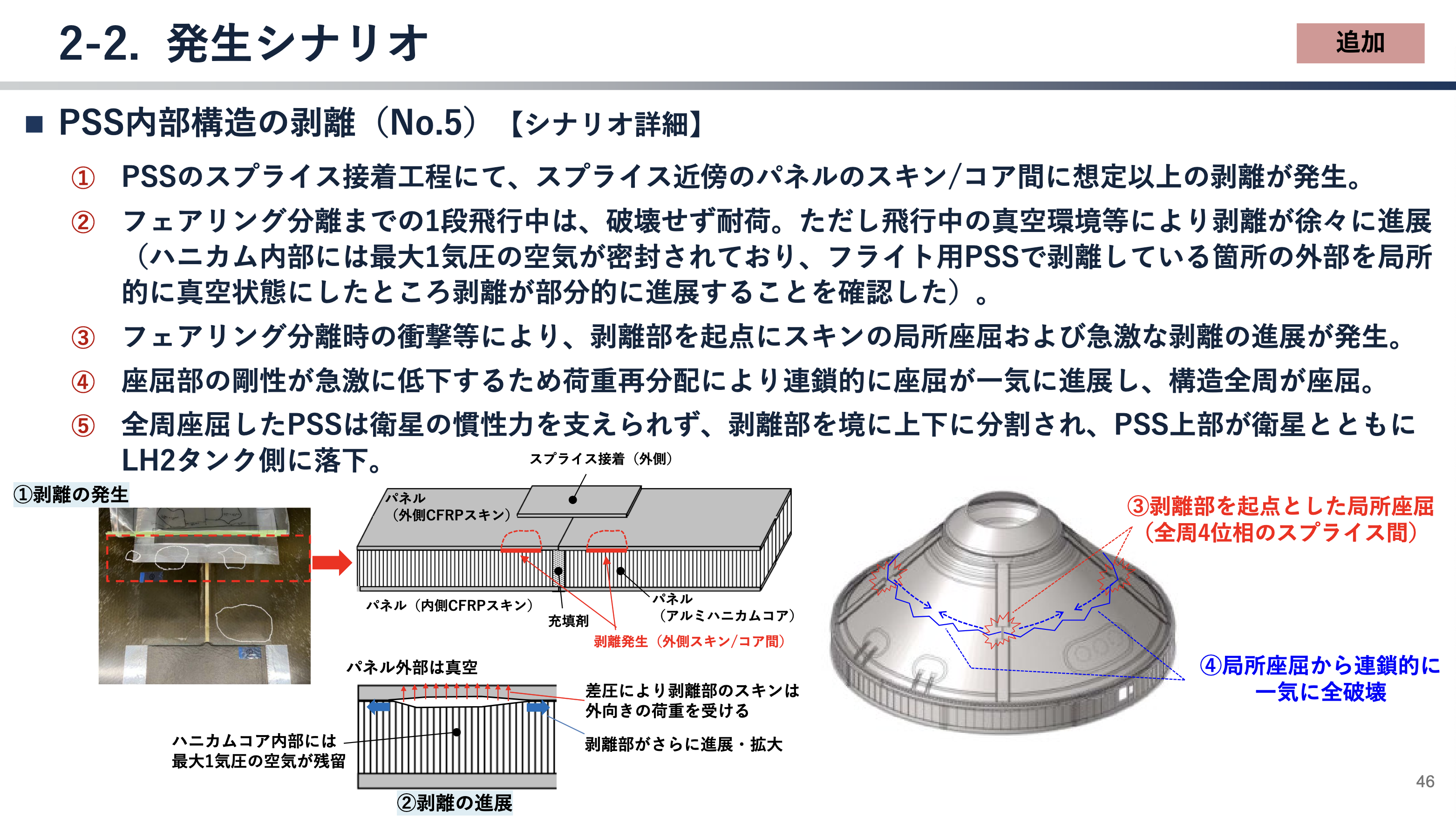 地上に保管していた衛星搭載アダプタ(PSS)に剥離が見つかったとのこと。H-IIAまではファスナ結合していたが、H3では接着剤による結合に変更されていて、接着不良があったらしい。